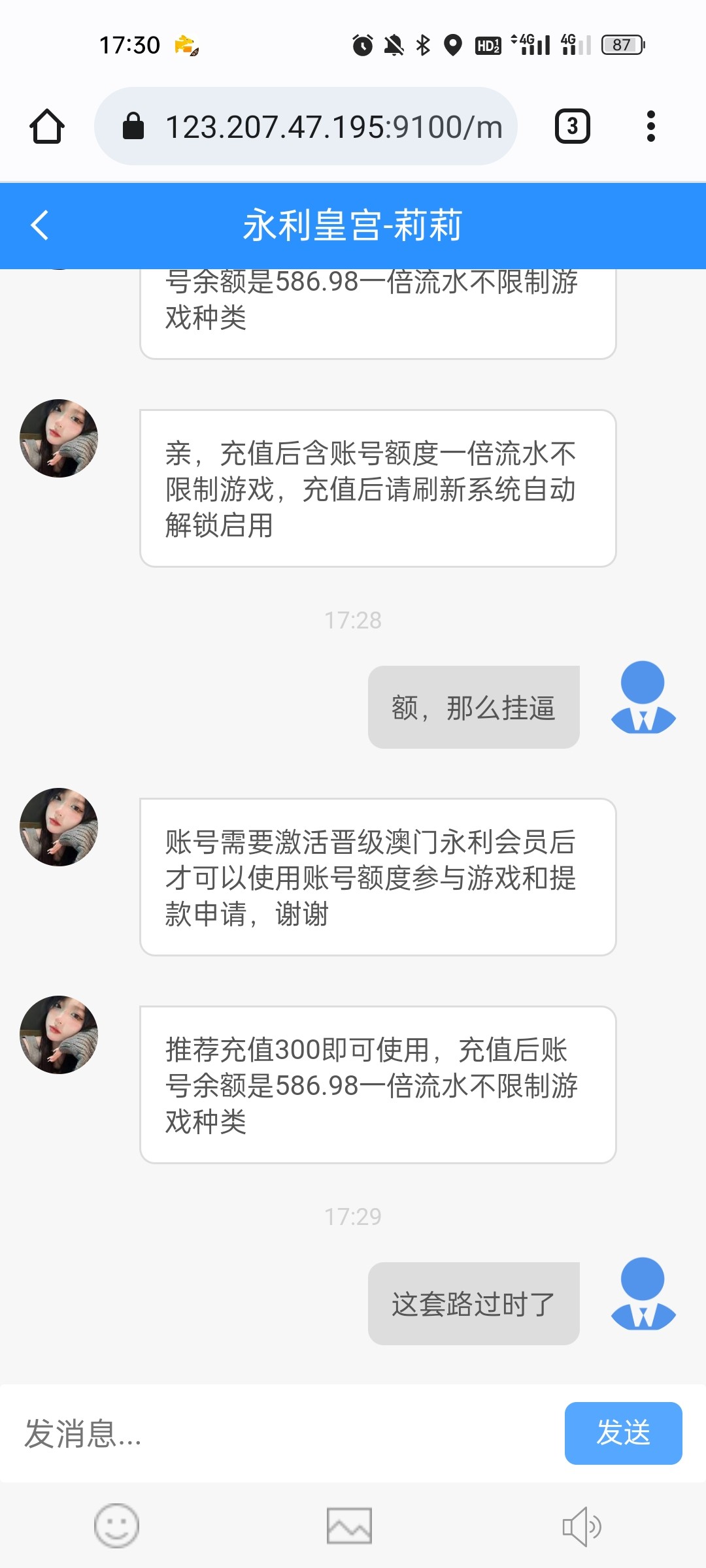 这个台子去年玩玩过几次,也让赢,但是当时忍不住收手都下去了,算起来输了有几千块钱吧,今天给我打电话说有神秘彩金,388-8888,加了联系方式后说要存款,送500,第一次送百分之二十,我想就充个五百块钱吧,送我一百赢他个几百就下,结果必须得充值后再取款才送,我尼玛这套路,不过还好赢他2k,取款几十秒到账,逼套路实在太深,我要回农村。