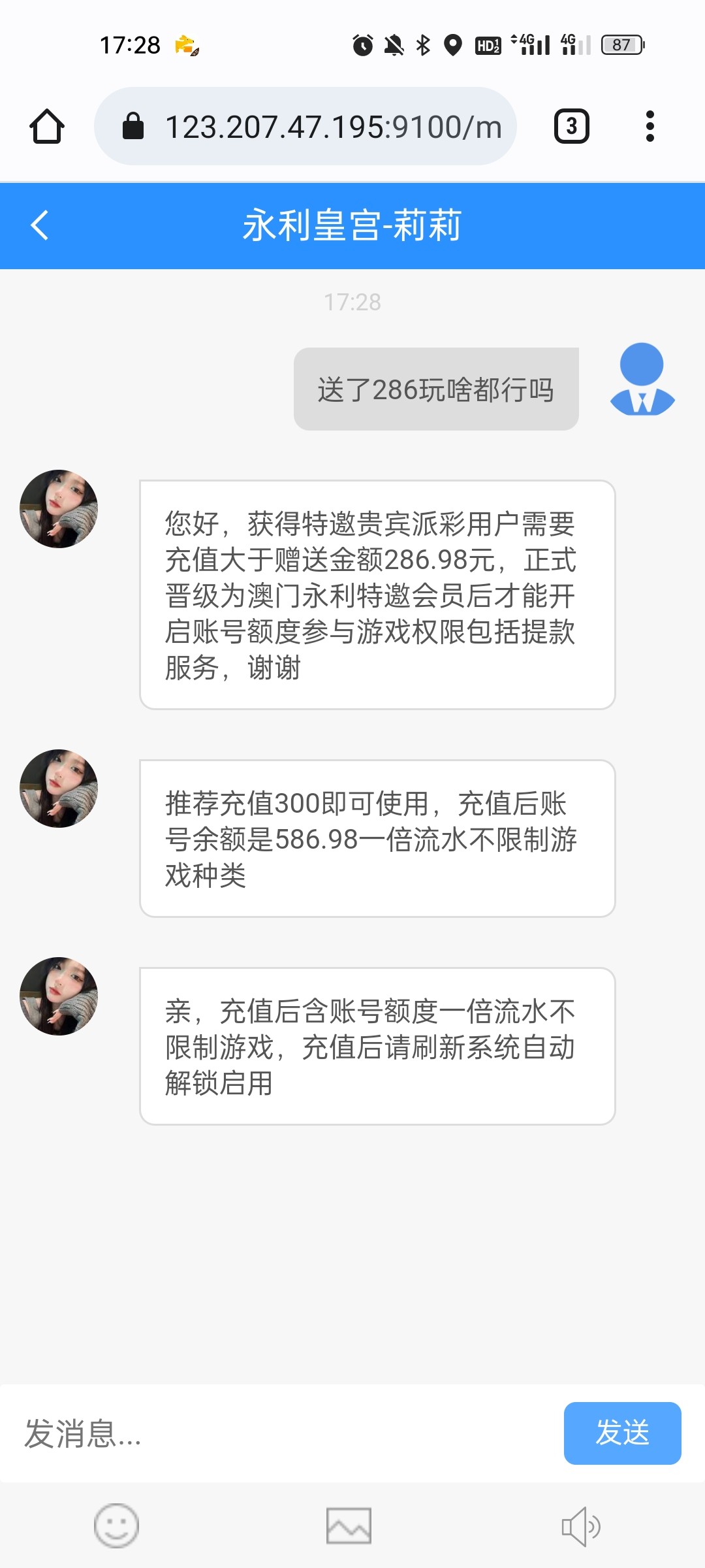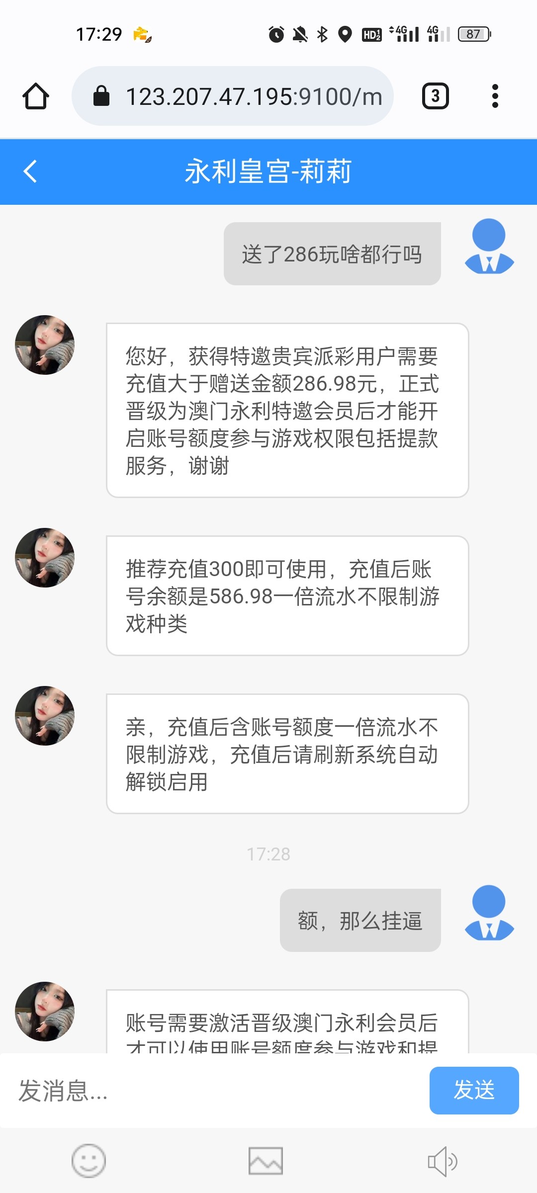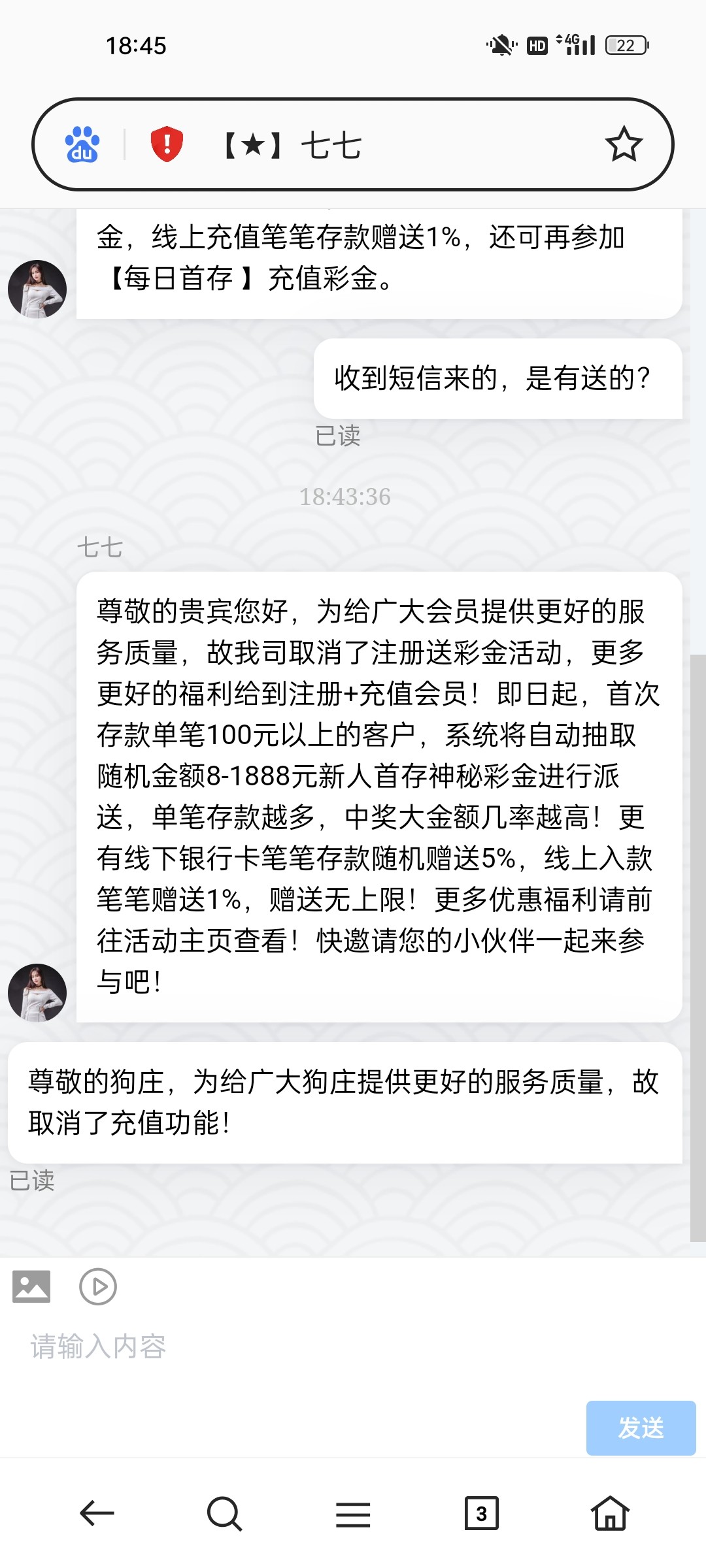 慕杨666: 对的,天天收到,又不送,有这发信息的钱不如最少送个18体验体验,有水赢了提现说不定还会反充进去玩