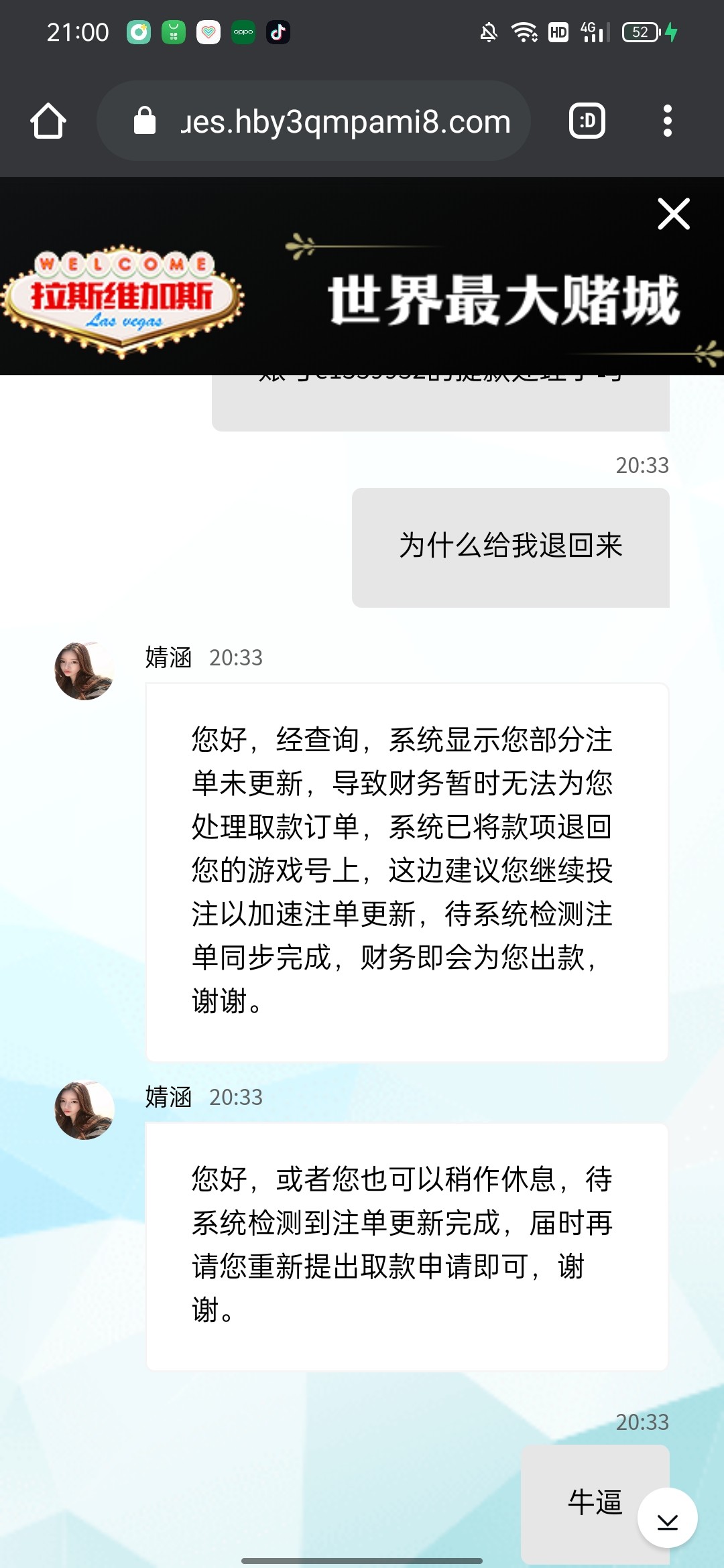 拉斯维加斯现在小额也开始黑了,下午充值100+58提了200不给出退回了,说注单没更新,过了几个小时提了本金,退回还说我注单没更新,现在小额开始黑了,黑台别玩