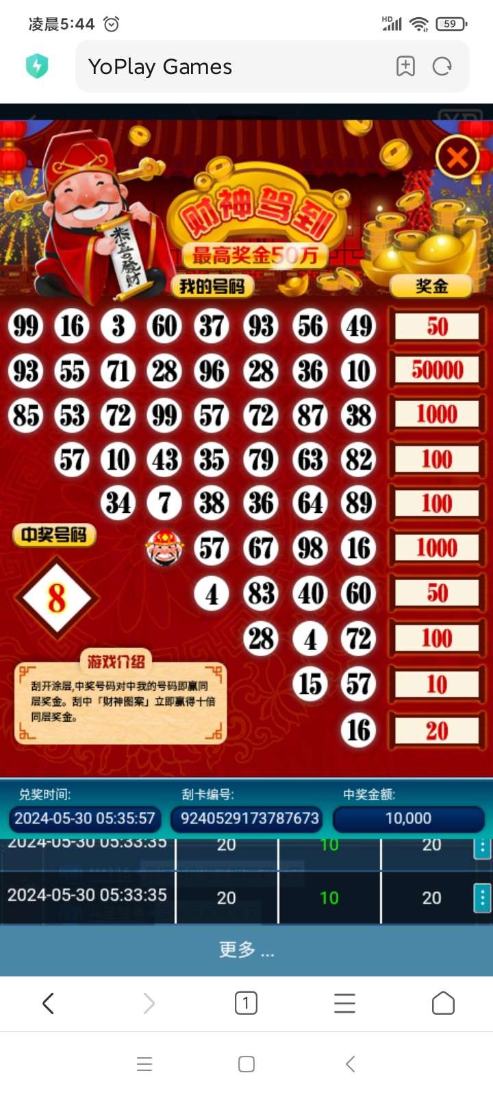 我这个月这台子输了7000多,然后凌晨又冲1600打到3000死了,另一个棋牌台子有60佣金打了1600提出来又跑这边冲了。上头了想着玩刮刮卡,直接来个大奖