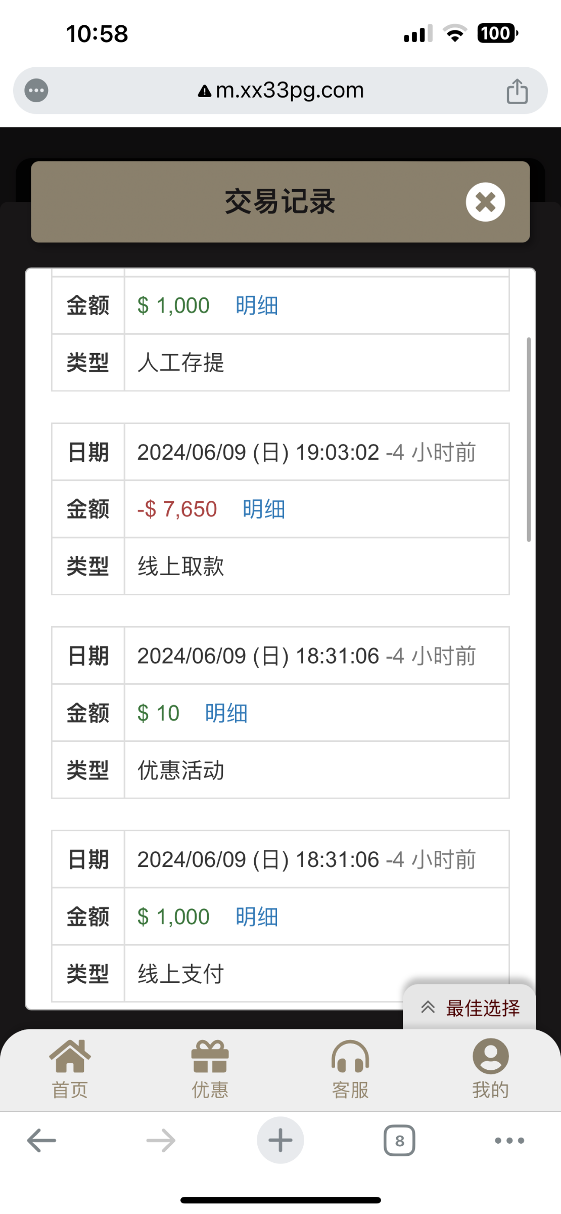 避雷33pg.com黑款7650元