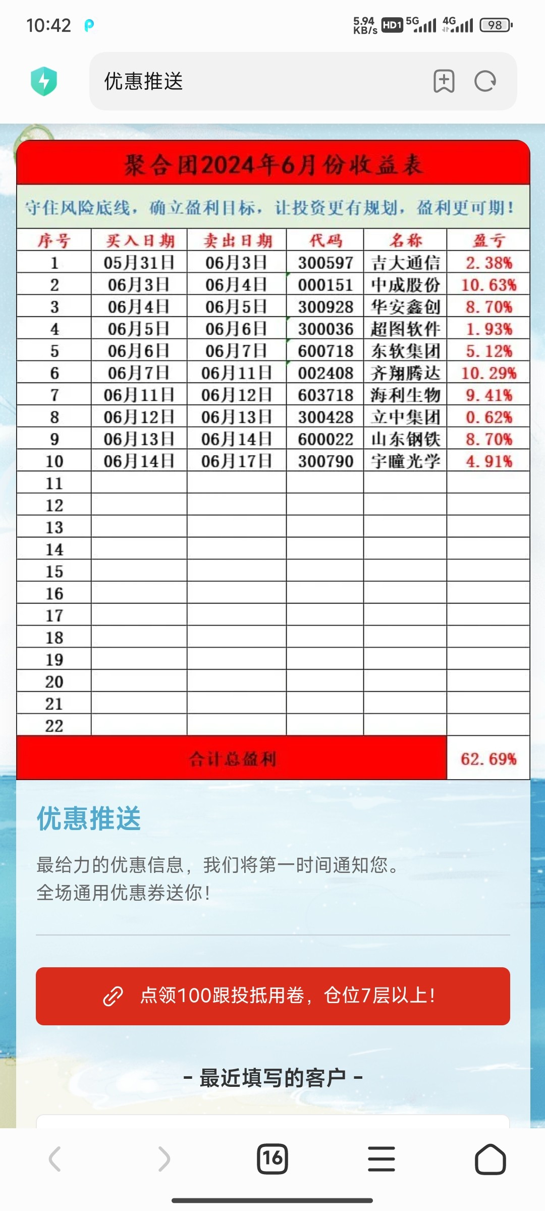 跟接待员的聊天记录注意看最后那里,他主动提出让我提款,我还想问他送的100能不能提来着没想到直接给提,自己充了100 送了100 投资收益10块钱,总共提210