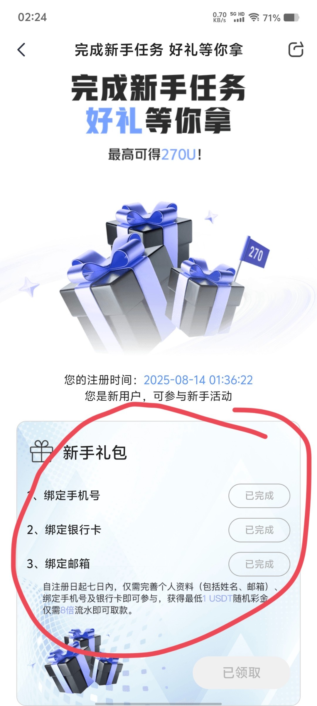 ↓完成新手任务可以奖励,完成绑定手机号获得1u,完成绑定银行卡获得1u,完成绑定邮箱随机抽1u-270u