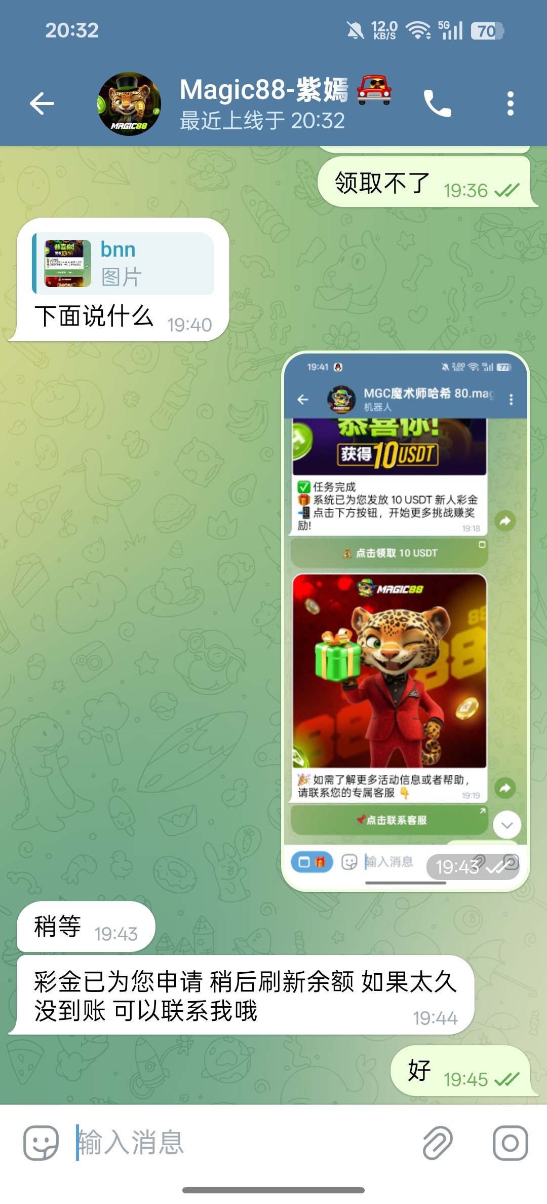 拉自己小号关注机器人加入群组就可以领取10u,没到联系客服叫她添加就行,彩金最多提10u