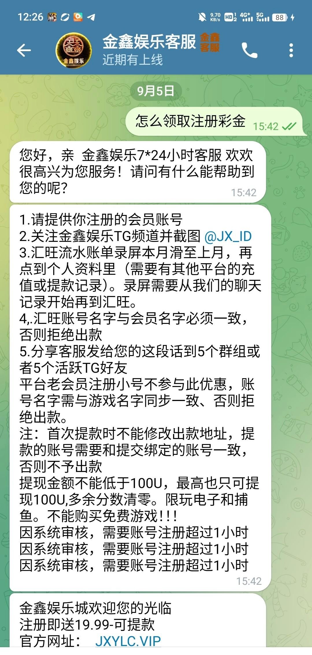 金鑫娱乐城联系飞机客服@JXYLCKF,按照客服要求注册,我欧意流水也给了,最高最低100u,我没打出来