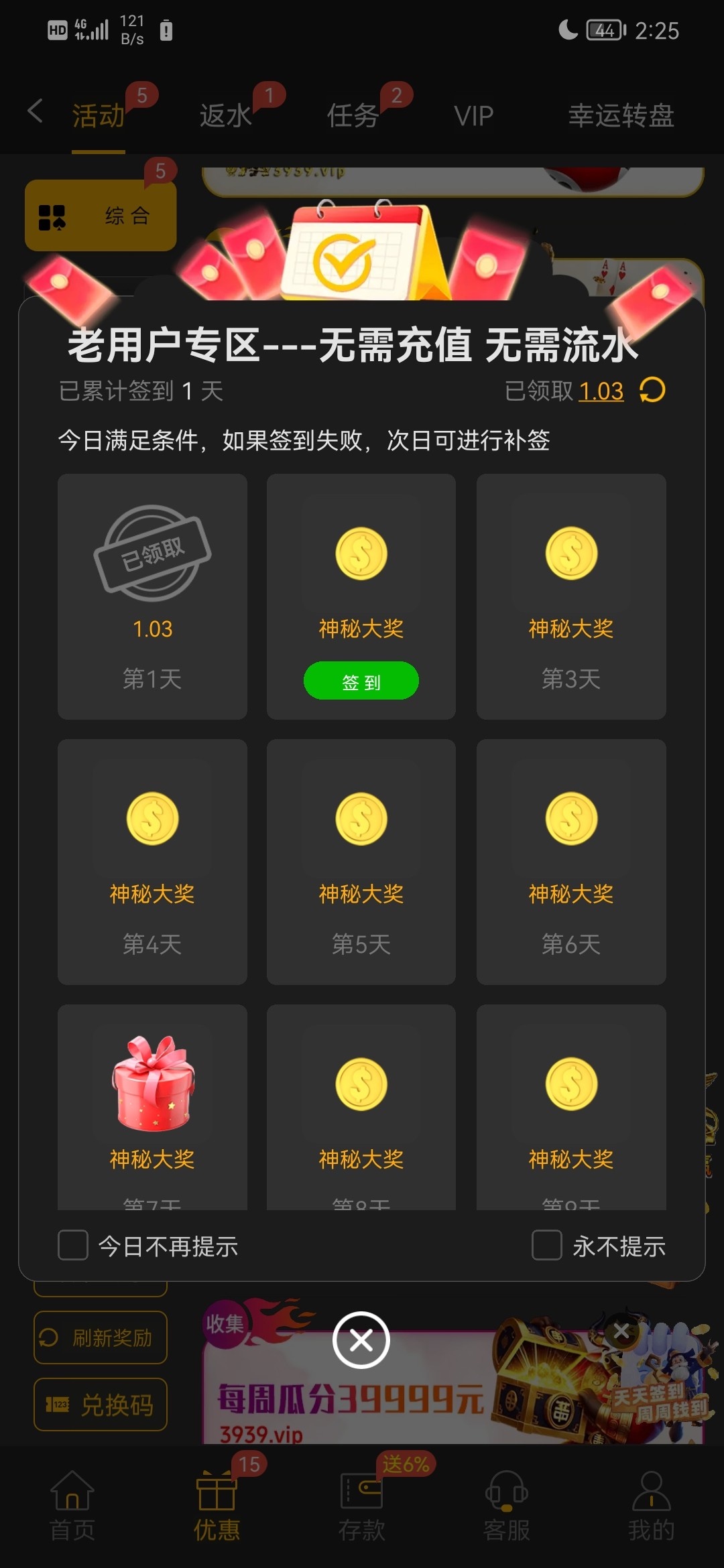 老用户签到不用充值 还有100包赔领包赔要签到7天 我签到第一天12块钱