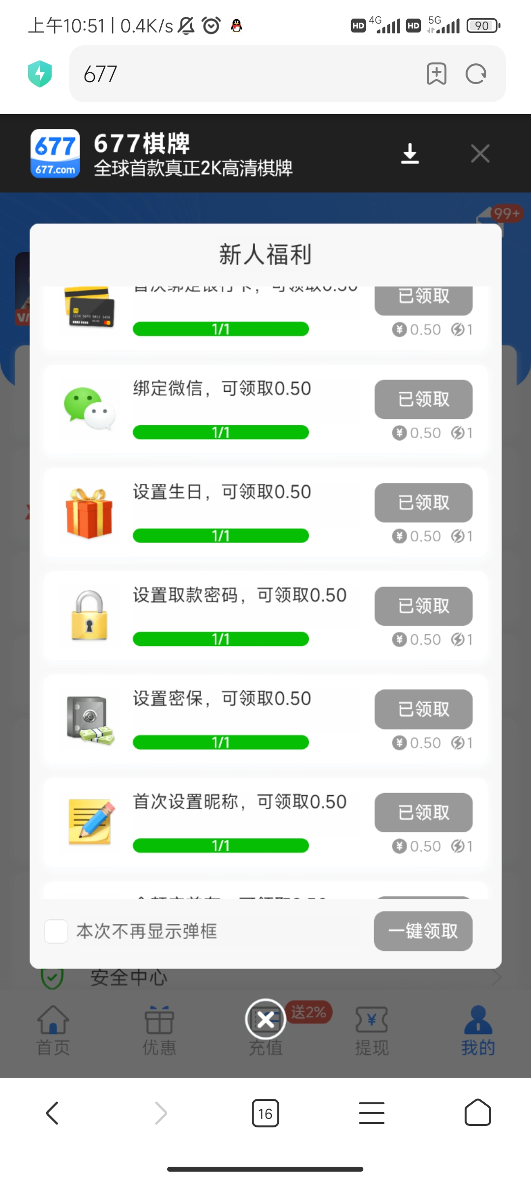 注册完成新人任务领取10,先玩677游戏捕鱼,打三水可以提现,好像最低提现10,不限制游戏,可以小额充值玩。