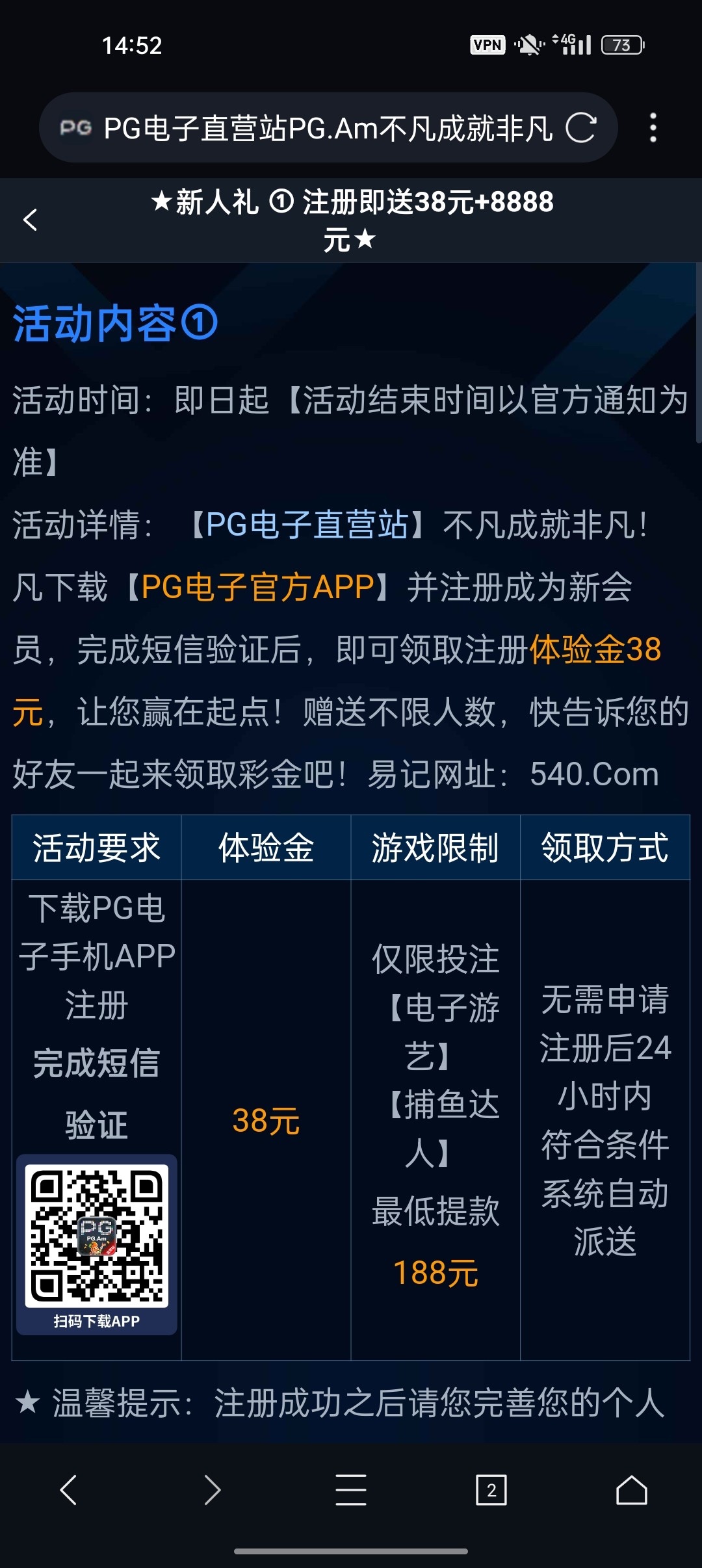 活动:跟以前发过的那个新PG电子不是一个平台 最新出来的 新用户必须先下载app 再注册绑卡绑定手机号 24小时内自动赠送38彩金 游戏和提款限制自行查看优惠